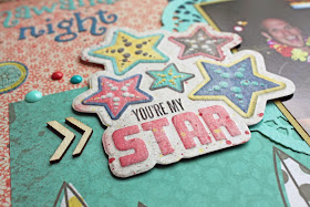 Here I used a few more items from the Heidi Swapp ephemera pack as well as some Studio Calico wood veneers, a doily, and some sparkly sequins!
