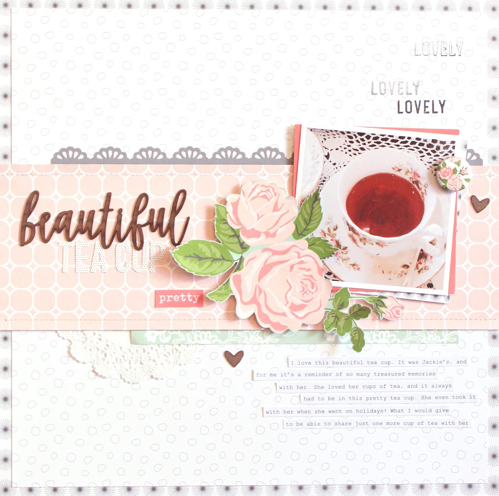 The gorgeous florals in this kit reminded me of my late mother-in-law's beautiful tea cup, and I thought it would be the perfect opportunity to document her love of this tea cup. Sadly she's been gone for 8 1/2 years, and I still miss her so much, but I actually quite enjoyed creating this page, because it brought back such happy memories of times spent enjoying cups of tea with her.